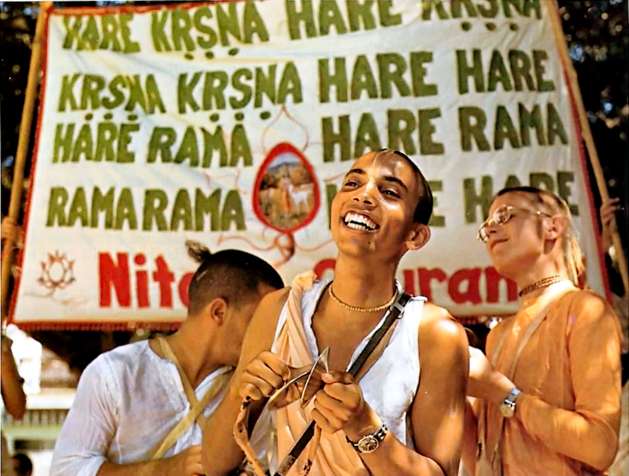 Similarly, sound representation of the Lord, in terms of His characteristics, is the complete form of the Lord, as was seen by Vāsudeva and Mahārāja Daśaratha, the fathers of Lord Kṛṣṇa and Lord Rāma. The sound representation of the Lord is nondifferent from the Lord Himself because the Lord and His representation in sound are absolute knowledge. Lord Caitanya has instructed us that in the holy name of the Lord, as sound representation of the Lord, all the potencies of the Lord are invested. Thus one can immediately enjoy the association of the Lord by the pure vibration of the sound representation of His holy name, and the concept of the Lord is immediately manifested before the pure devotee. A pure devotee, therefore, is not aloof from the Lord even for a moment. The holy name of the Lord, as recommended in the śāstras-Hare Kṛṣṇa, Hare Kṛṣṇa, Kṛṣṇa Kṛṣṇa, Hare Hare/ Hare Rāma, Hare Rāma, Rāma Rāma, Hare Hare-may therefore be constantly chanted by the devotee aspiring to be constantly in touch with the Supreme Lord. One who is thus able to associate with the Lord is sure to be delivered from the darkness of the created world, which is a product of false ego (tamasi mā jyotir gama).