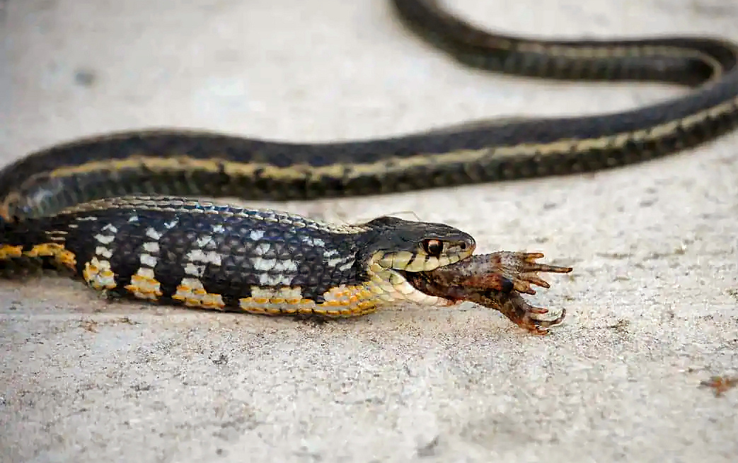 A frog is eaten by a snake, a snake is eaten by a mongoose,