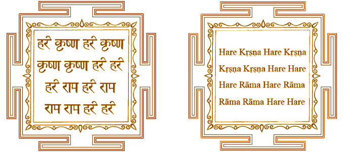 The mahā-mantra is a thirty-two syllable mantra chanted requesting Harā (another name of Hari’s supreme pleasure energy, personified by Śrīmatī Rādhārāṇī), and the Supreme Lord (given by two of His names, Kṛṣṇa, the All-Attractive One, and Rāma, the Reservoir of Pleasure) an opportunity to serve Them. When chanted the mahā-mantra is a petition to God: »O energy of the Lord, O Lord Kṛṣṇa, please engage me in Your service«.