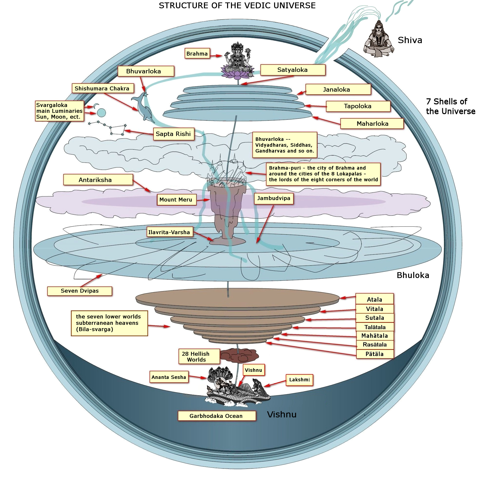 "There are three planetary systems, namely the lower worlds, the intermediate worlds and the upper worlds. The human beings on earth are situated at the beginning of the intermediate worlds, but living beings like Brahmā and his contemporaries live in the upper worlds, of which the topmost is Satyaloka. In Satyaloka the inhabitants are fully cognizant of Vedic wisdom, and thus the mystic cloud of material energy is cleared." (SB 1.19.23)
