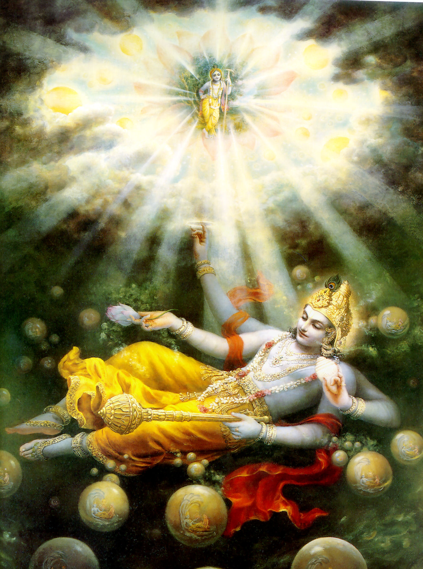 To benefit all living beings in all the varied planets and to increase the power of those elephants and of the demigods, the Lord manifests Himself on top of that mountain in a spiritual body, uncontaminated by the modes of material nature. Surrounded by His personal expansions and assistants like Viṣvaksena, He exhibits all His perfect opulences, such as religion and knowledge, and His mystic powers such as aṇimā, laghimā and mahimā. He is beautifully situated, and He is decorated by the different weapons in His four hands. (SB 5.20.40)